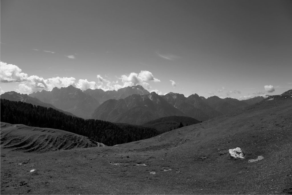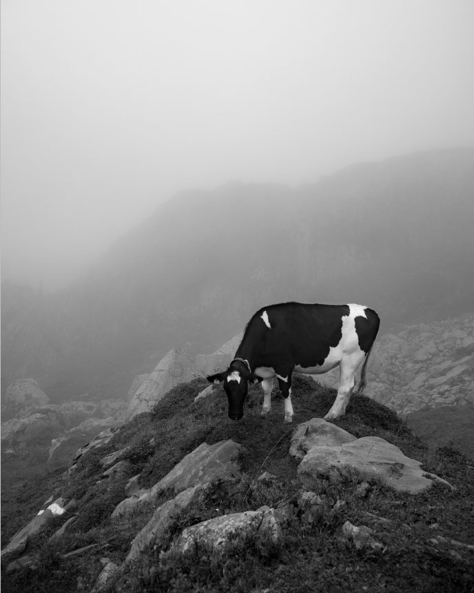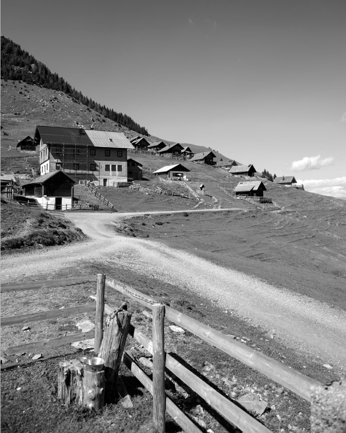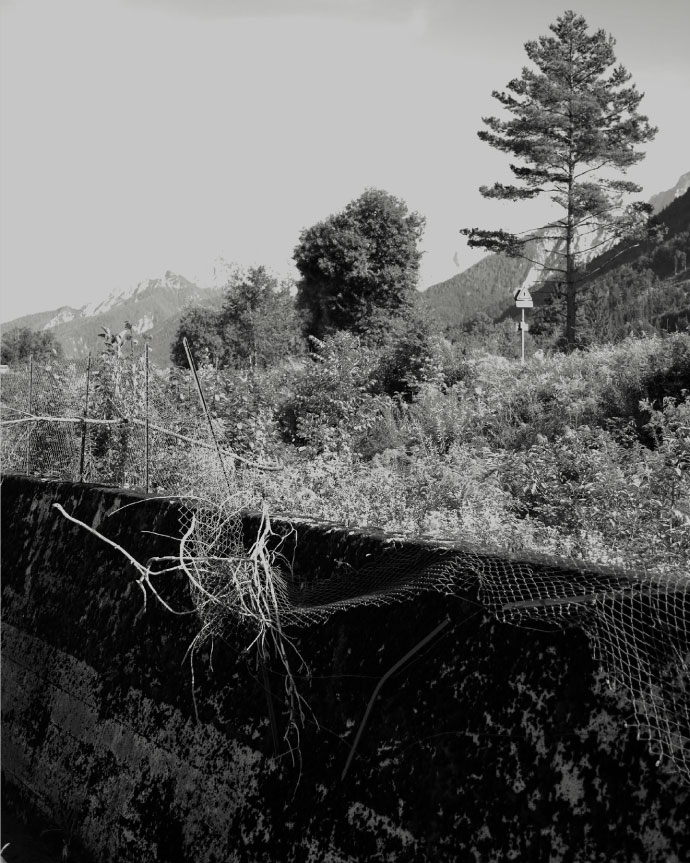 La linea è lì, definita da cippi rettangolari posizionati a intervalli regolari. La loro presenza è incongruente tra i detriti rocciosi, le tane delle marmotte e i pini neri. Circondati dal verde, risaltano i cippi bianchi decorati con lettere nere. Sono gli umili rappresentanti di questo tratto umano, che segna come confini di proprietà tra vicini ciò che è “nostro” e ciò che è “estraneo”. A prima vista, sono gli unici segni della presenza umana. Poi notiamo le file di alberi e vediamo che sono tutti della stessa specie, quella utilizzata per produrre legno per la fabbricazione di assi dritte. Poi, tra gli alberi, sentiamo prima e poi distinguiamo il respiro rauco e il rumore sordo degli zoccoli delle mucche che pascolano tra gli alberi. L'umidità delle rive del fiume ci fa rabbrividire, mentre l'acqua viene convogliata in tubi sotterranei che lasciano il sentiero asciutto per permetterci di camminare.