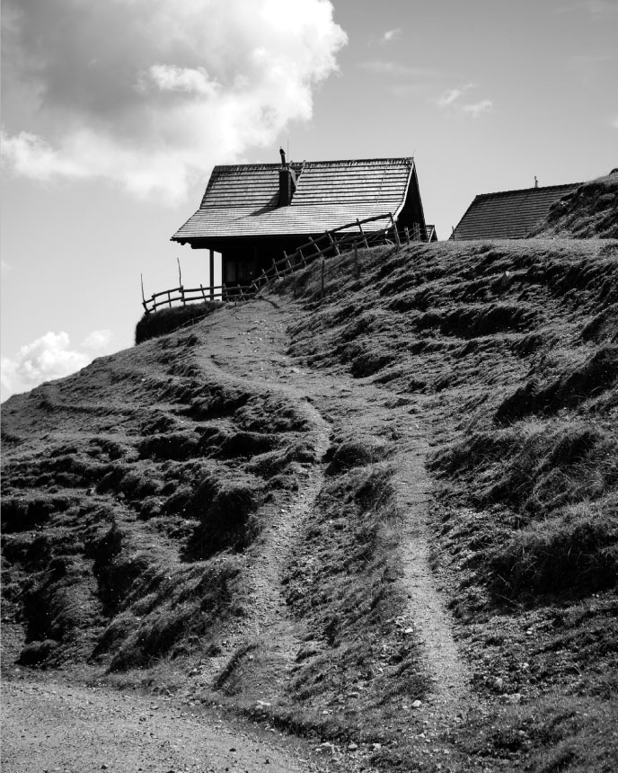 Una piccola pietra bianca, insignificante, dall'aspetto modesto. Incorniciata da tre capanne. Protetta al centro. Una pietra di confine. Quanto è inappropriato per una pietra che si trova proprio al centro. Irrilevante per noi escursionisti che, dopo lunghi percorsi su sentieri boschivi solitari, desideriamo ardentemente un incontro. Seguiamo le conversazioni nella vivace capanna. Infrastruttura significa sicurezza. Acqua e cibo. Protezione dalle intemperie. In equilibrio sulla linea delle pietre bianche, possiamo scegliere: sinistra o destra? Una decisione facile, se seguiamo solo i nostri bisogni: il profumo del caffè, i volti amichevoli.
