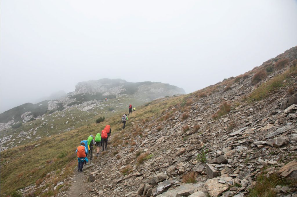 Ci incontriamo l'un l'altro. Gli alberi passano in secondo piano. Gli sguardi si incrociano. Le velocità di marcia si adeguano. I nostri passi sono in sintonia con il battito dei bastoni da trekking. Perché siamo tutti qui, su questo sentiero? Lingue sconosciute canticchiano la canzone su cui balliamo. Tra cartelli, alberi e cippi di confine. Acquistiamo fiducia condividendo l'incertezza. A pranzo. Con storie complementari che raccolgono le nostre impressioni e le intrecciano in un tutto.